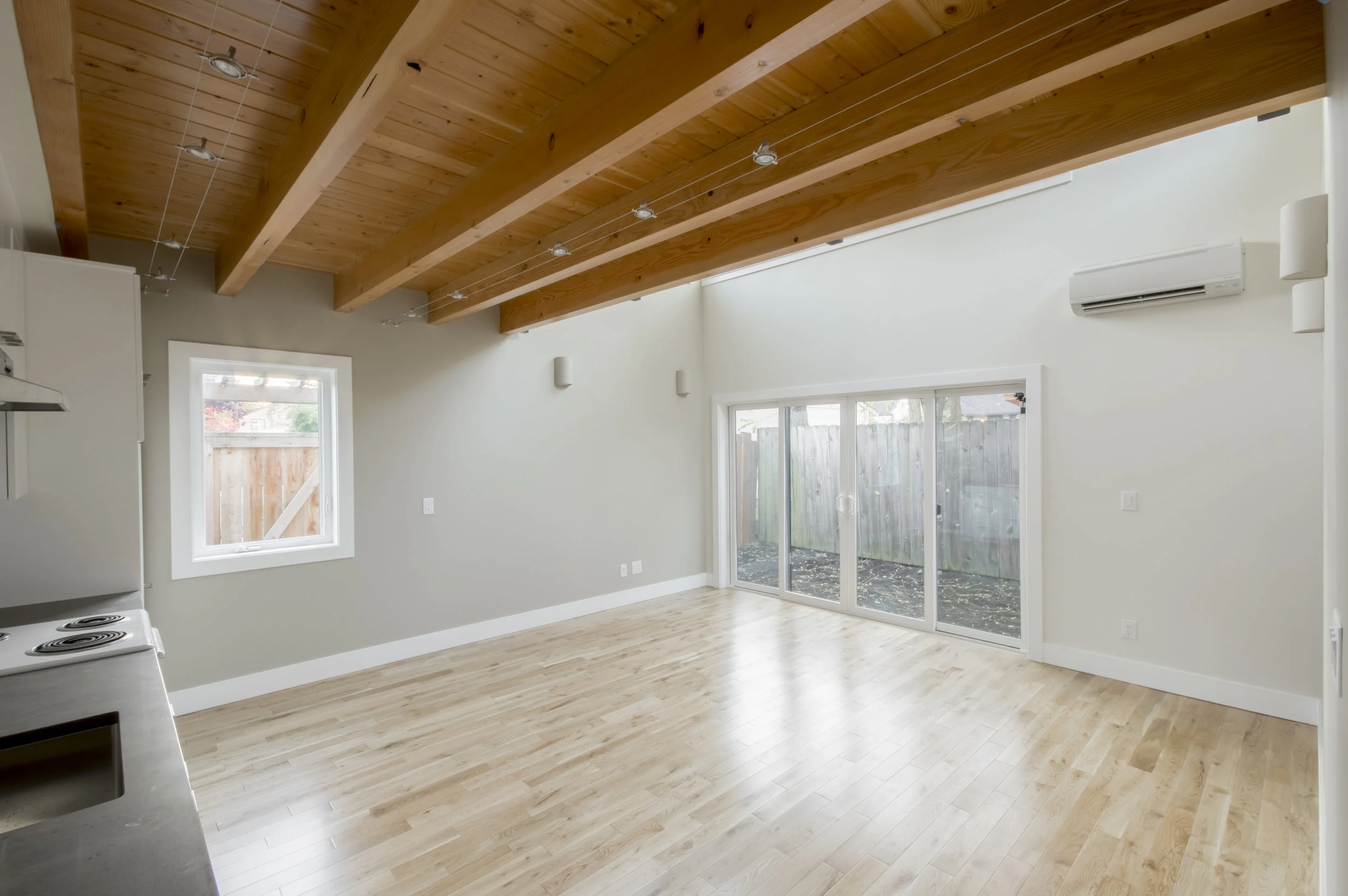 Exposed fir beams, tongue-and-groove fir kitchen ceiling and porch soffits. Custom built-in cabinets, device charging station, and steel cable handrails. Accent wall made from ship-lap paneling salvaged from the garage previously onsite. High efficiency ductless heat pump and upgraded insulation package.